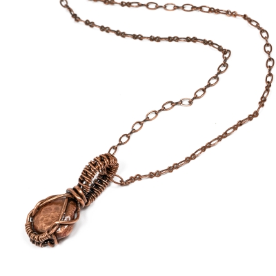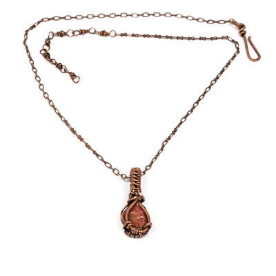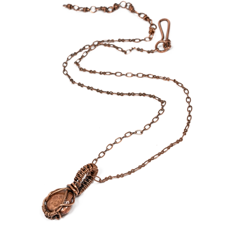 Featuring a tightly-woven centerpiece. A raw copper pebble stone is set into a simple wire-wrapped pendant, creating a piece that can truly be worn for any occasion. The necklace measures 19'' long but can be adjusted to any shorter length. The pendant measures almost 1 1/2'' long. Liver of Sulfur is used to create an antique finish.