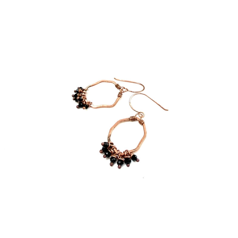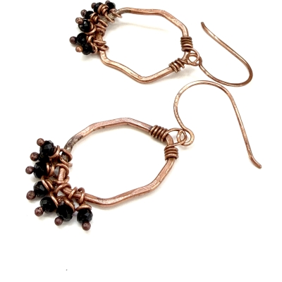 Created out of pure vintage copper wires and a cluster of small faceted glass black beads. Measures 1 and a 1/2 inches long. French wire hooks. The Liver of Sulfur is used to create an antique finish. The earrings are protected with a thin layer of ProtectaClear to prevent tarnishing.