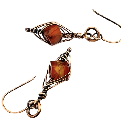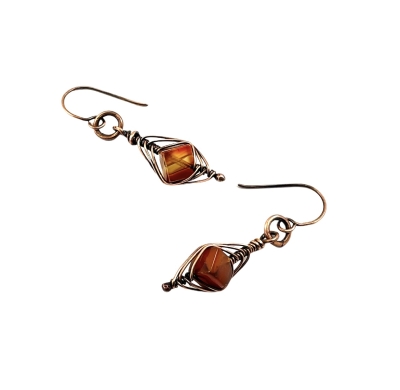Created out of oxidized pure copper wires. A singular honey agate stone is elegantly wrapped using a herringbone stitch. Measures 1 3/4'' long. French wires. Liver of Sulfur is used to create an antique finish.