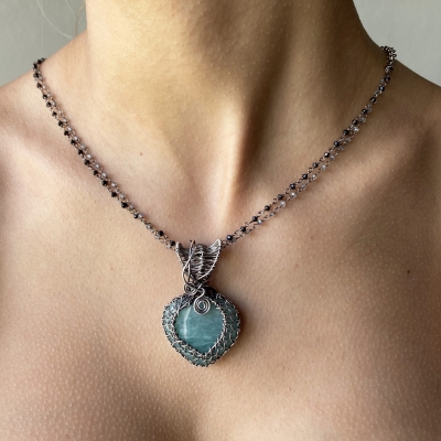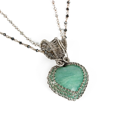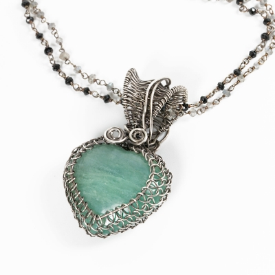 Hand-crafted silver chain with inclusions of both black spinel and labradorite wire-wrapped stones. A netted, heart-shaped Russian Amazonite stone with a big decorative bail gives this necklace an exclusive appearance. Necklace measures 23'' long but can be adjusted to any shorter length. Pendant measures 2'' long. Liver of Sulfur is used to create an antique finish.