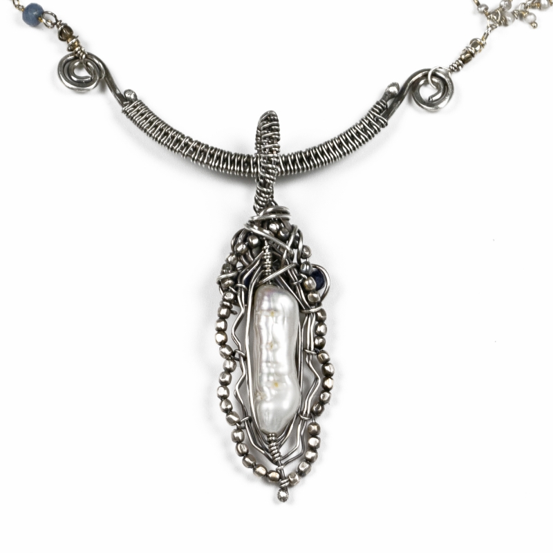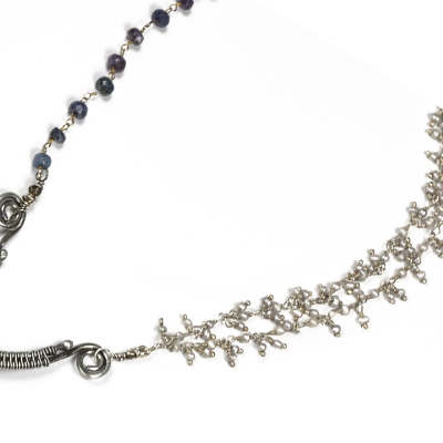 This necklace showcases one elongated white Pearl and three Sapphire gems as the main element. Finished with segments of the Saphire and tiny freshwater pearls on opposite sides. Liver of Sulfer is used to create an antique finish. 20 and 1/2 inches long but can be adjusted to any shorter length. Unique and handcrafted with love.