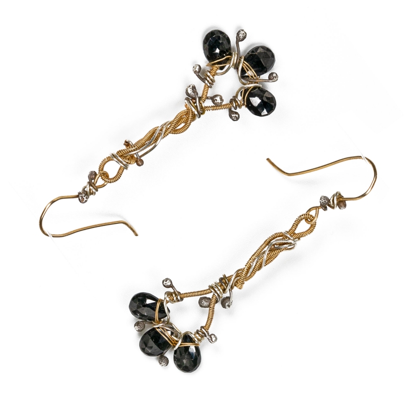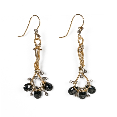 Hand-crafted with silver and gold-filled wires, three faceted black spinel gems are held together in a simple and yet elegant wirework design. Each earring is delicately wrapped with coiled wires, including hand-torched buds. Earrings measure 2" long. French wires. Liver of Sulfur is used to create an antique finish.