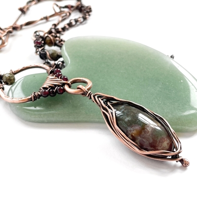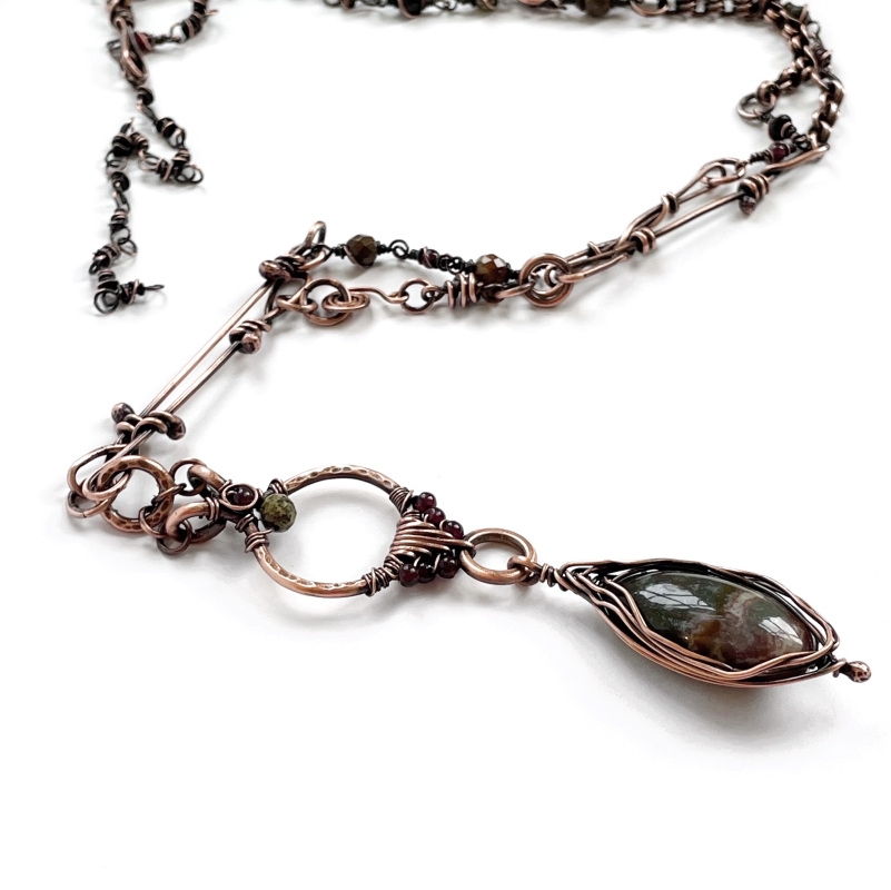 Handcrafted vintage copper chain, with inclusions of gemstones and hand-made copper links. The pendant includes two components: one bloodstone stone wire-wrapped in herringbone stitch, and a triangle component with a garnet embellishment. The necklace measures 34 1/2'' long. Liver of Sulfur is used to create an antique finish. It is protected with a thin layer of ProtectaClear to prevent tarnishing.
