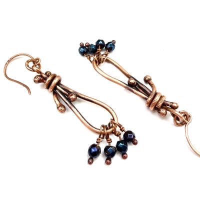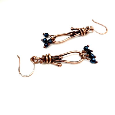 Created out of pure vintage copper wires and a cluster of small faceted blue beads. Measures 2 and a 1/2 inches long. French wire hooks. The Liver of Sulfur is used to create an antique finish. The earrings are protected with a thin layer of ProtectaClear to prevent tarnishing.