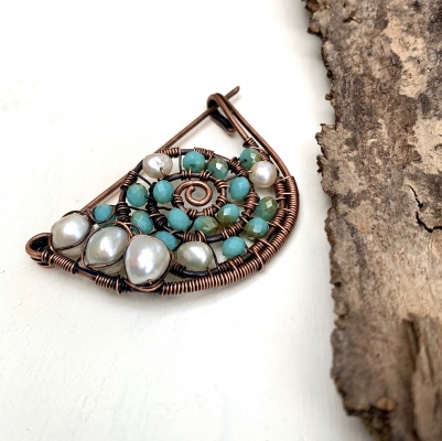 Hand-crafted out of vintage, pure copper wires. Blue crystal beads and white pearls are held together in this stunning swirl design. Measures 3 x 1 3/4'' Long. Liver of Sulfur is used to create an antique finish. The pin is protected with a thin layer of ProtectaClear to prevent tarnishing.