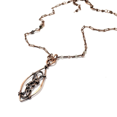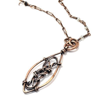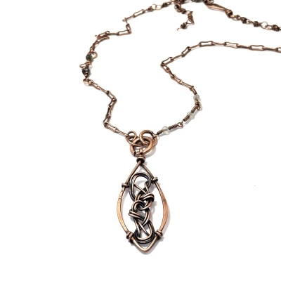 This Celtic-themed necklace is handcrafted out of pure copper wire. The centerpiece measures 1x2 inches and showcases a beautifully woven Celtic knot. The necklace measures 21 inches long and can be shortened to any other length. Liver of Sulfur is used to create an antique finish. It is protected with a thin layer of ProtectaClear to prevent tarnishing.