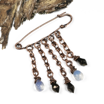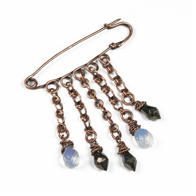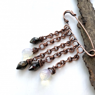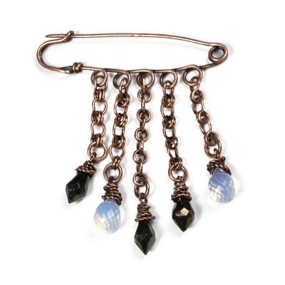 Simple Celtic pin created out of pure vintage copper wires with five hand-crafted chain links. Clear and black glass beads hand delicately from this design. Measures 2 1/2 x 3 '' L . Liver of Sulfur is used to create an antique finish. To prevent tarnishing a thin layer of ProtectaClear is used.