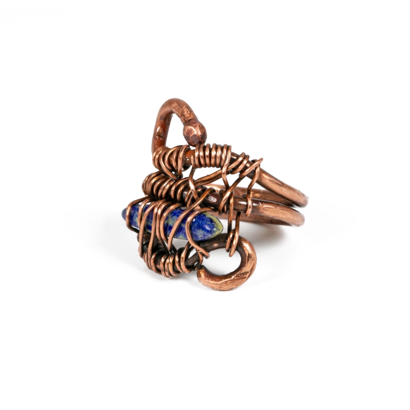 Hand-crafted out of vintage copper wires, this ring features a beautiful Lapis stone wrapped in a vertical design. Measures ring size 6 1/2. Liver of Sulfur is used to create an antique finish. Protected with a thin layer of ProtectaClear to prevent tarnishing.