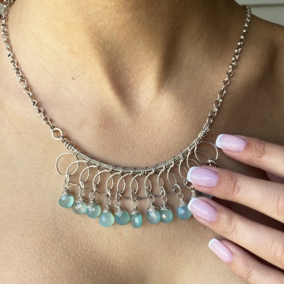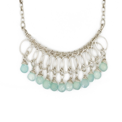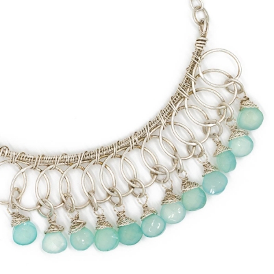 This necklace features beautifully crafted silver loop components, delicately holding 12 drops of chalcedony. Everything is hand-done, including the sterling silver chain holding the piece together. The necklace measures 21" long but can be adjusted to any shorter length. The wire-worked center measures 3 1/2".