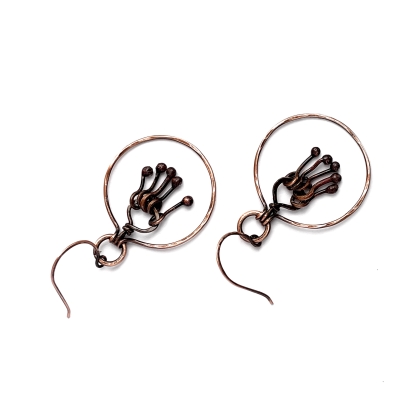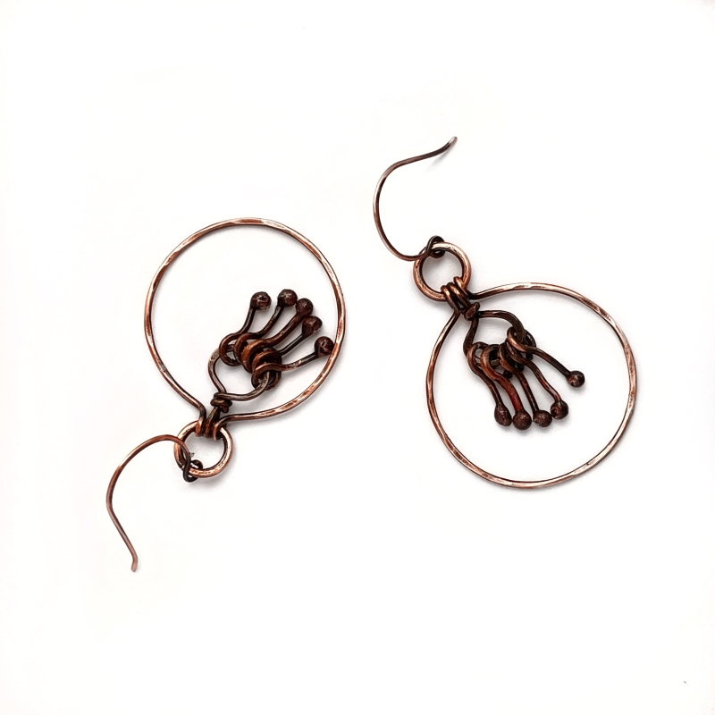 Hand-crafted out of vintage, pure copper wires with small chimes to create a more interesting hoop earring. Earrings measure 2" long. French wires. The Liver of Sulfur is used to create an antique finish. The earrings are protected with a thin layer of ProtectaClear to prevent tarnishing.
