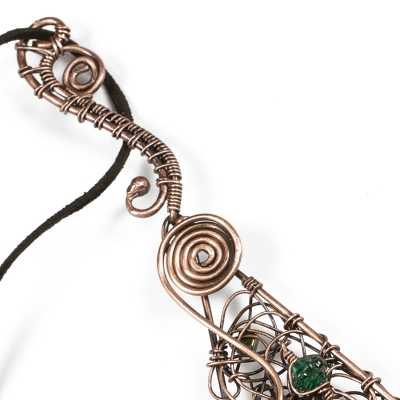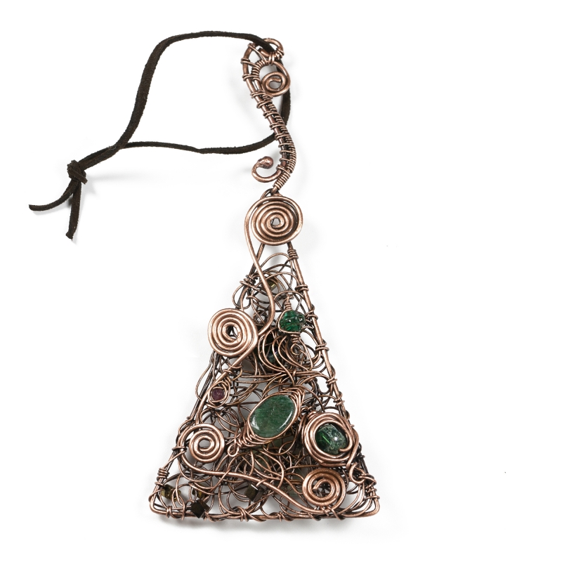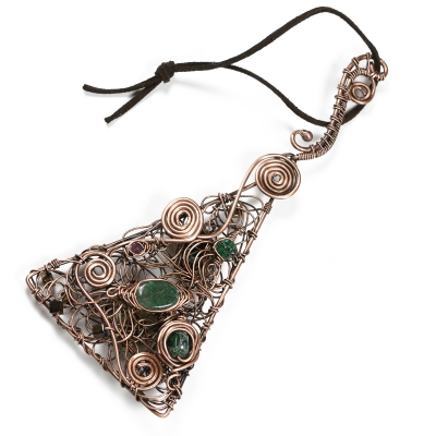 This winter ornament ​is crafted from vintage copper wire and an assortment of green gems and seed beads. Modern swirls and a free-form design create this one-of-a-kind Christmas ornament. Protected with a thin layer of ProtecaClear to prevent tarnishing.