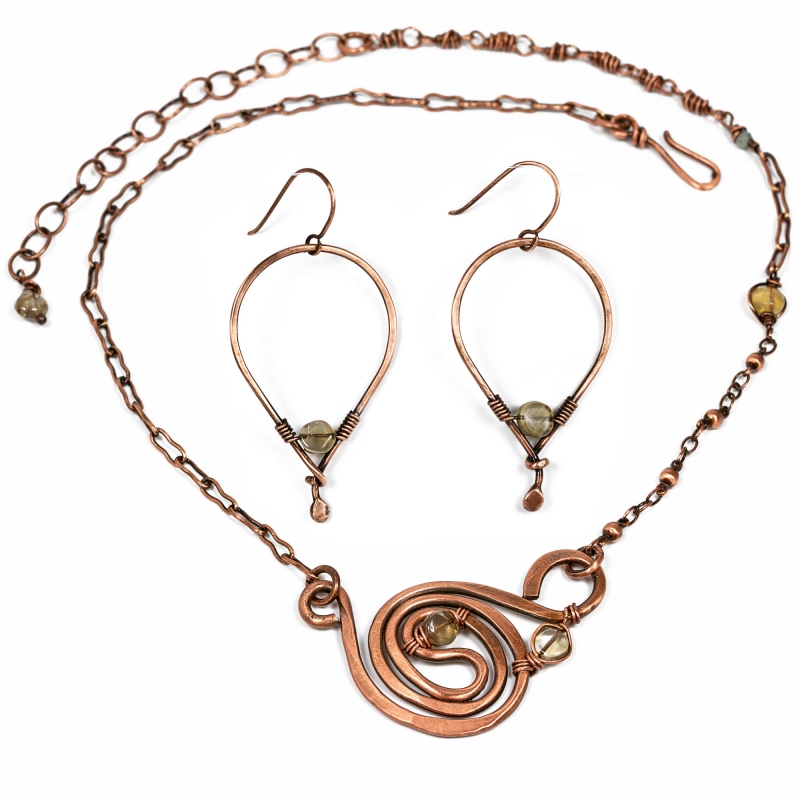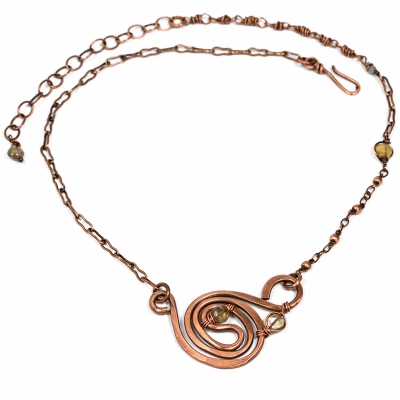This statement necklace is handcrafted out of pure copper wire and has a citrine stone as the centerpiece. The necklace measures 22" long, can also be shortened to any other length. Liver of Sulfur is used to create an antique finish. It is protected with a thin layer of ProtectaClear to prevent tarnishing.