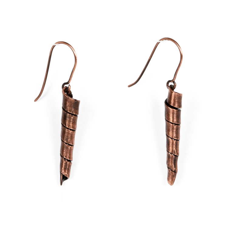 Hand-crafted from copper, this simple design makes use of vintage elevator flat wires! Truly an every-day wear piece, can be matched with many outfits. Measures 1 3/4" long. French wires. Liver of Sulfur is used to create an antique finish. The earrings are protected with a thin layer of ProtectaClear to prevent tarnishing.