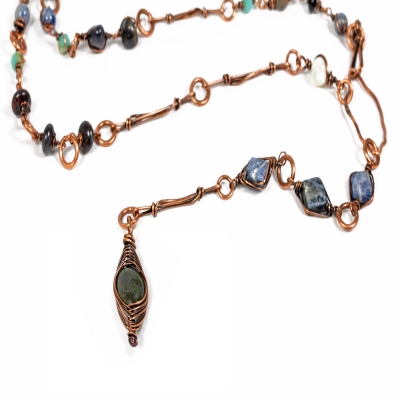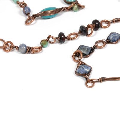 The long copper necklace is made from a variety of blue gemstones and hand-made copper links. The clasp can be fastened to three different points, creating a new necklace each time––get creative! Necklace measures 40" L. Liver of Sulfur is used to create an antique finish. Protected with a thin layer of ProtectaClear to prevent tarnishing.