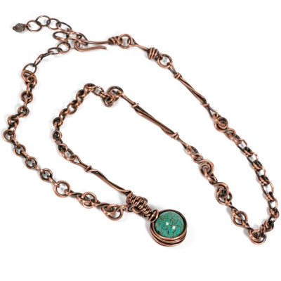 This simple necklace was created with hand-made copper chains and a simple Howlite cabochon. A few copper components add variety to the piece, while still keeping it a simple, everyday-wear piece. The necklace measures 20'' long, but can also be shortened to any other length. Liver of Sulfur is used to create an antique finish. It is protected with a thin layer of ProtectaClear to prevent tarnishing.