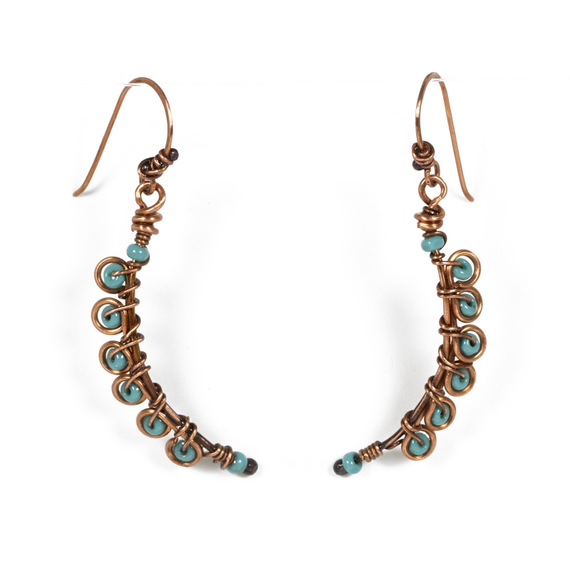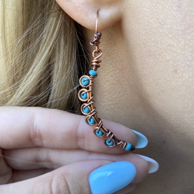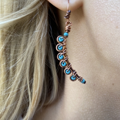 Handcrafted pure copper earrings, created out of vintage wires and bright blue seed beads. Measures 2''long. French wires. The earrings are protected with a thin layer of ProtectaClear to prevent tarnishing.