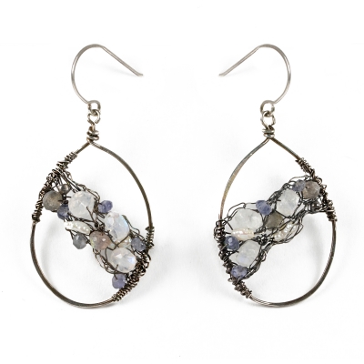 These earrings are handcrafted out of sterling silver wire using a crochet technique and a variety of gemstones including iolite, moonstone, and labradorite. Measures 2 inches long. French hook. Liver of Sulfur used to create an antique look.