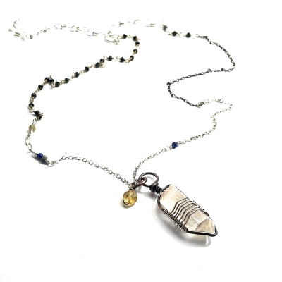 This everyday piece was created to attract wealth and prosperity ( Citrine) love (Lapis Lazuli and Quartz) and Manifestation( Labradorite). The necklace measures 21 1/2'' long, but can be adjusted to a shorter length. This chain comes with various designs such as rosary links, chin links, and handcrafted chains to make this piece your go-to jewelry to use.