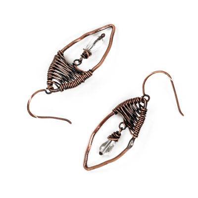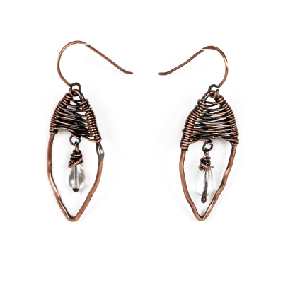 Hand-crafted from vintage copper wires: soldered, and wires completely by hand. These abstract foliate earrings feature copper leafs-ovals and crystal clear quartz. Measures 1 3/4 '' long. French wires. Liver of Sulfur is used to create an antique finish. The earrings are protected with a thin layer of ProtectaClear to prevent tarnishing.