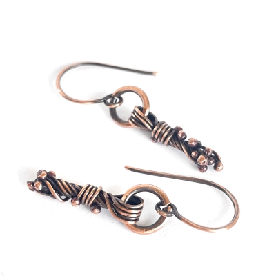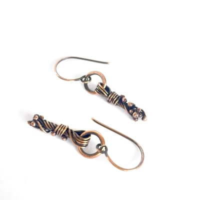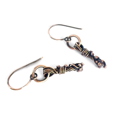 Hand-crafted from vintage copper wires: jump ring holds delicate wire copper tassle completely done by hand. Measures 1 1/2' long. French wires. Liver of Sulfur is used to create an antique finish. The earrings are protected with a thin layer of ProtectaClear to prevent tarnishing.