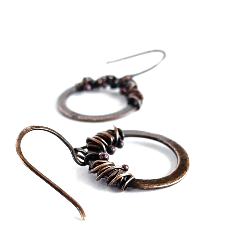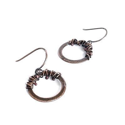 Hand-crafted out of vintage, pure copper wires which are weaved together to create a more interesting hoop earring. Earrings measure 1 1/4" long. French wires. The Liver of Sulfur used to create an antique finish. The earrings are protected with a thin layer of ProtectaClear to prevent tarnishing.