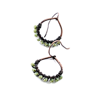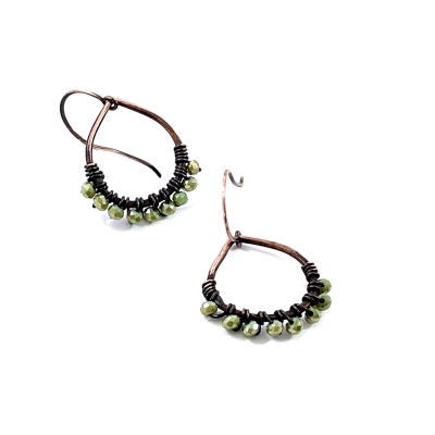 Hand-crafted from vintage copper wires: soldered, and wires completely by hand. These abstract foliate earrings feature green crystal beads wire-wrapped in the middle of each earring. Measures 1 1/4 '' long. French wires. Liver of Sulfur is used to create an antique finish. The earrings are protected with a thin layer of ProtectaClear to prevent tarnishing.
