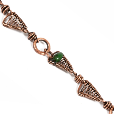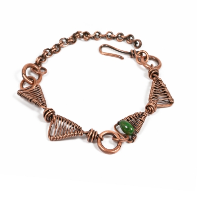 Handmade copper bracelet crafted out of vintage copper wires. The triangle component is woven in a simple basket-weave, with a singular howlite stone in one of a triangle motive. Measures 9''long. Liver of Sulfur is used to create an antique finish. The bracelet is protected with a thin layer of ProtectaClear to prevent tarnishing.