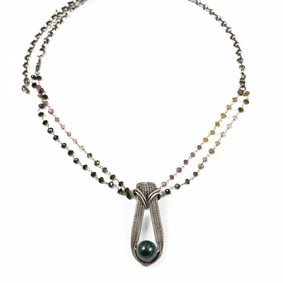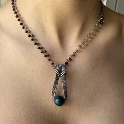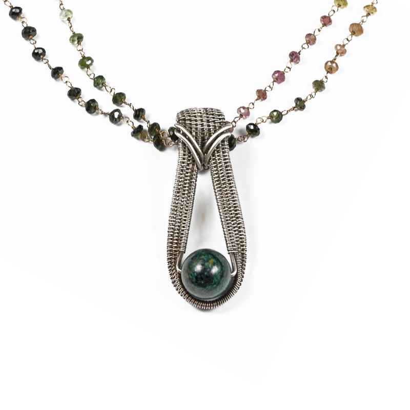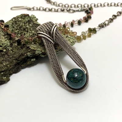 Completely hand-crafted from the silver chains to the focal point of the necklace––a delicately woven Eilat pendant. Necklace measures 21 3/4", but can be adjusted to any shorter length. Pendant measures 2". Liver of Sulfur is used to create an antique finish.