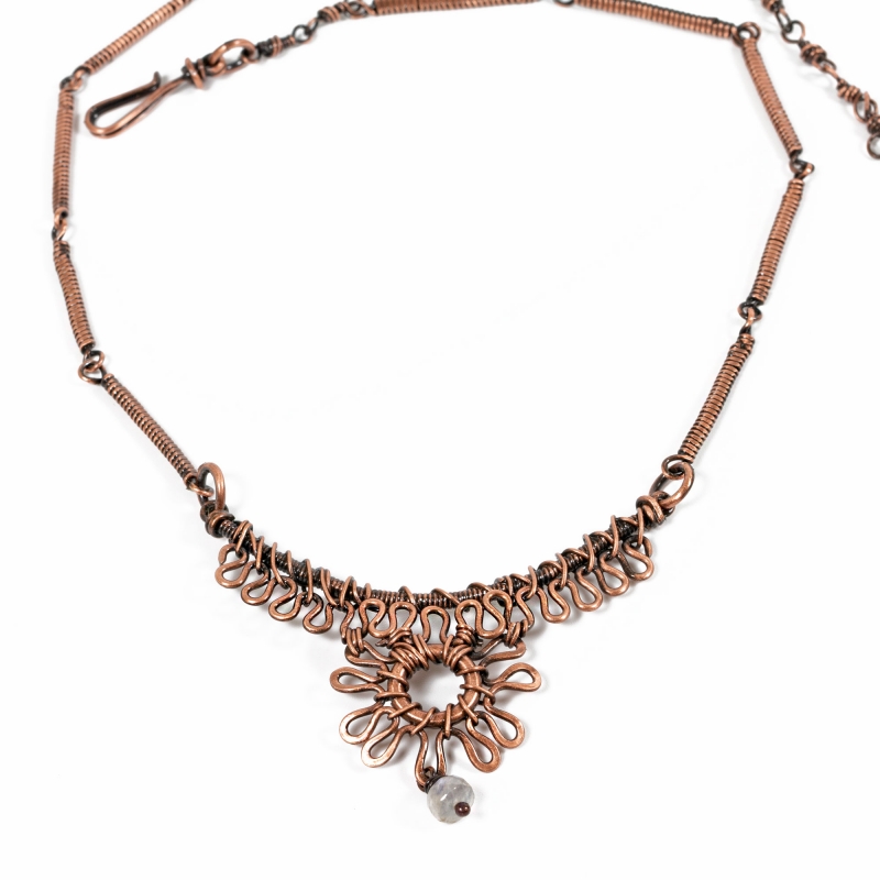 Handcrafted vintage copper chain with a centerpiece that is hand coiled and woven to create a delicate flower in the center. The necklace measures 16" long. The centerpiece is 2 1/2" long. Liver of Sulfer is used to create an antique finish. Protected with a thin layer of ProtectaClear to prevent tarnishing.