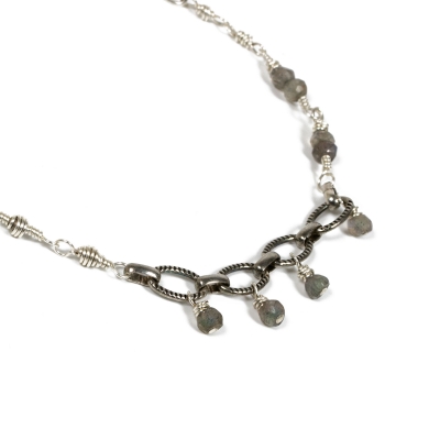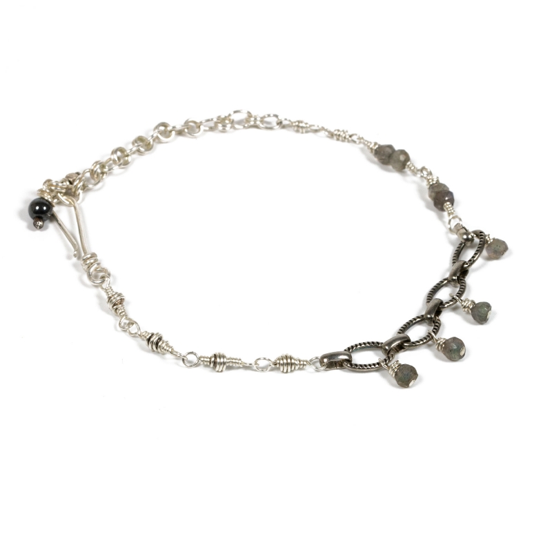 This bracelet is made from Sterling Silver wires, featuring eight small spherical Labradorite stones on an oval link segment. Finished with Sterling Silver chain to allow for a tighter fit. Measures 9 inches long.