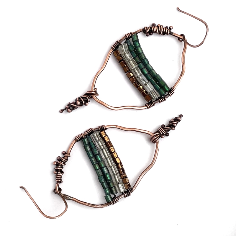Handcrafted from vintage pure copper wire, these oval-shaped earrings have tows of different colors woven in it. Measures 3 inches long. French wire hooks.