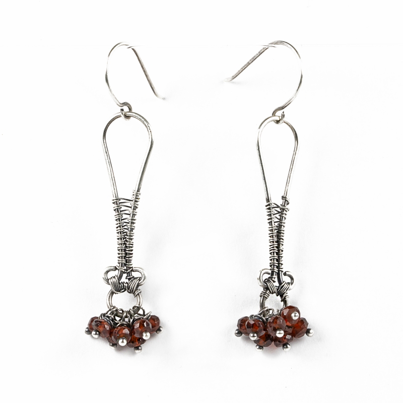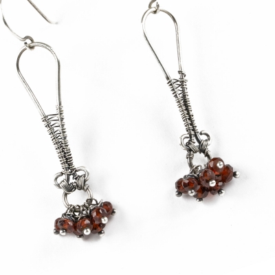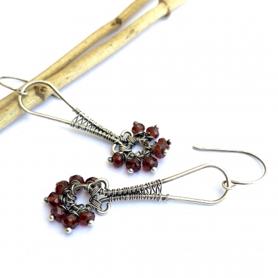 These beautiful garnet earrings are made out of sterling silver wires and 7 garnet faceted beads. It measures 2 1/4" long. French wires. Liver of sulfur is used to create an antique finish.