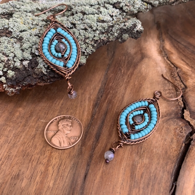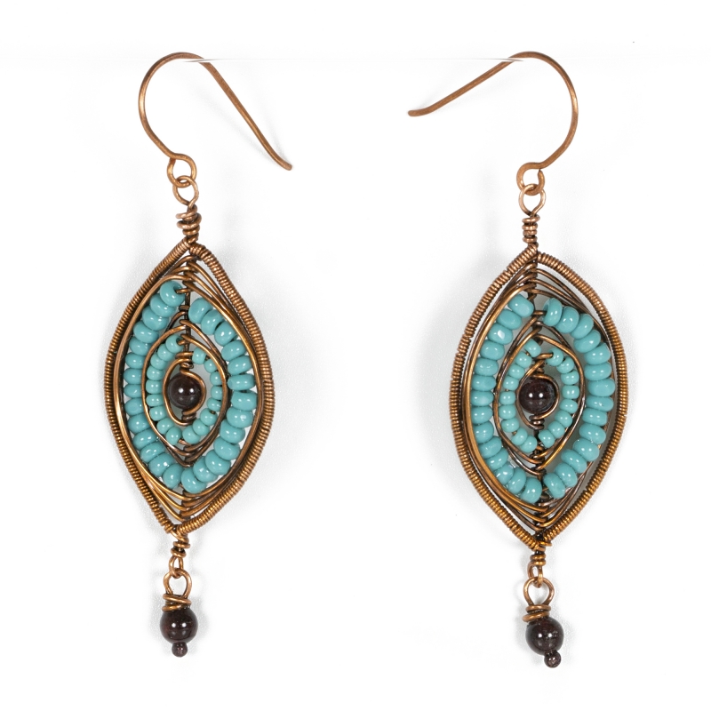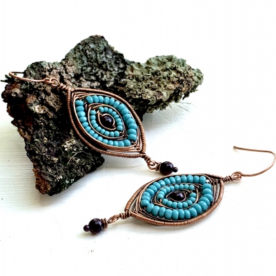 Hand-crafted out of vintage, pure copper wires which are weaved into a herringbone stitch to secure the center garnet stone and surrounding blue seed beads.-Tightly coiled copper finishes off the outside perimeter of the earrings. Earrings measure 2 1/2" long. French wires. The Liver of Sulfur used to create an antique finish. The earrings are protected with a thin layer of ProtectaClear to prevent tarnishing.