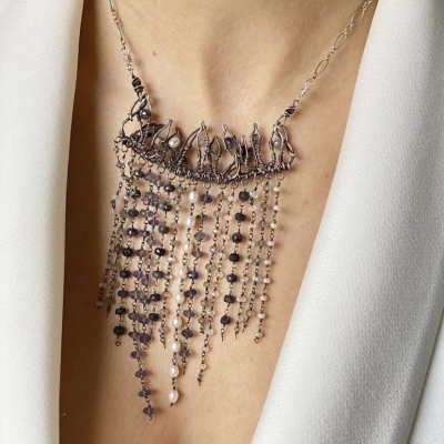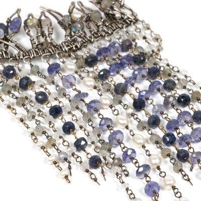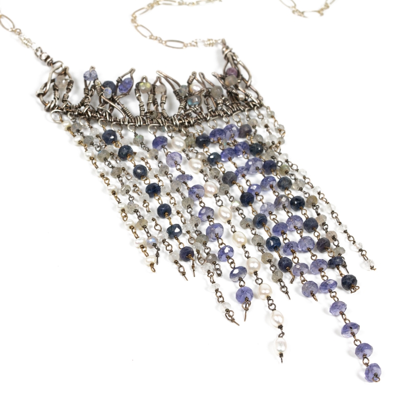 This waterfall design was handcrafted using a variety of gemstones, including Labradorite, Sapphire, and more. The middle element measures 3" wide and 4" long and was inspired by nature. Tiny leaves are wire wrapped individually and attached to the body of the piece. Truly a unique piece of jewelry. Necklace measures 20" long but can be shortened to the desired length. Liver of Sulfer is used to create an antique finish.