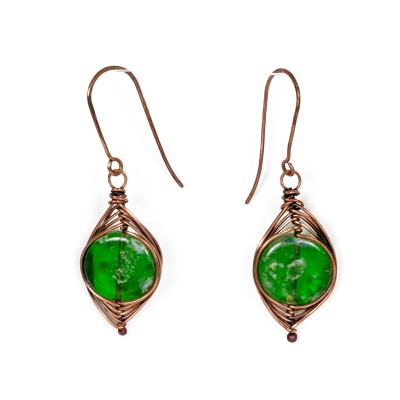 Handmade copper earrings crafted out of vintage copper wires. The bright green Czech beads are the centerpiece for these beautiful earrings. Measured at 2" L. French wires. LIver of sulfur is used to create an antique finish. The earrings are protected with a thin layer of Protectacear.