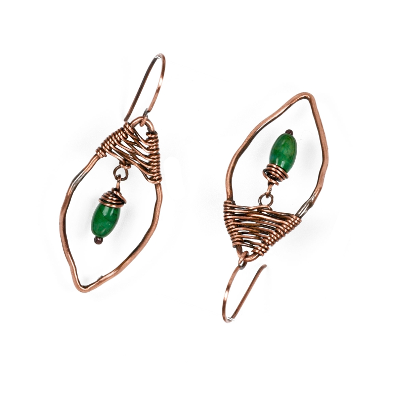 Hand-crafted from vintage copper wires: soldered, and wires completely by hand. These abstract foliate earrings feature green howlite wire-wrapped stones attached in the middle of each earring. Measures 2 '' long. French wires. Liver of Sulfur is used to create an antique finish. The earrings are protected with a thin layer of ProtectaClear to prevent tarnishing.