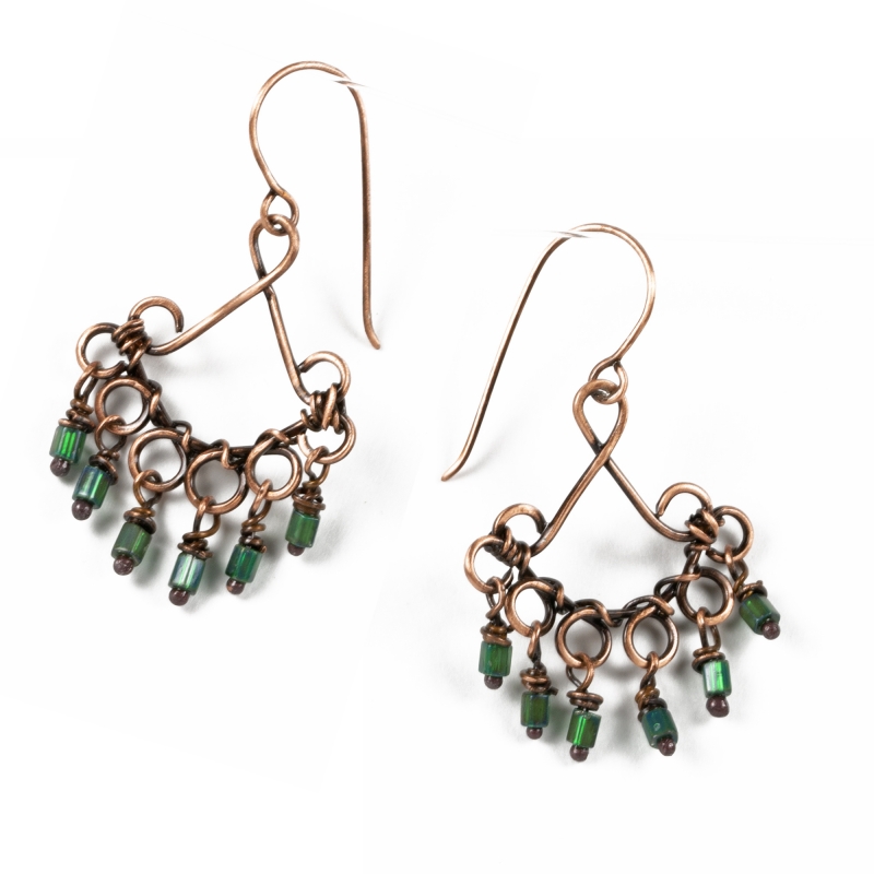 Vintage copper wires are elegantly curved to create a dainty lace effect. Six green Czech glass beads dangle from the wired design. Earrings measure 1 1/2" long. French wires. The Liver of Sulfur used to create an antique finish. The earrings are protected with a thin layer of ProtectaClear to prevent tarnishing.