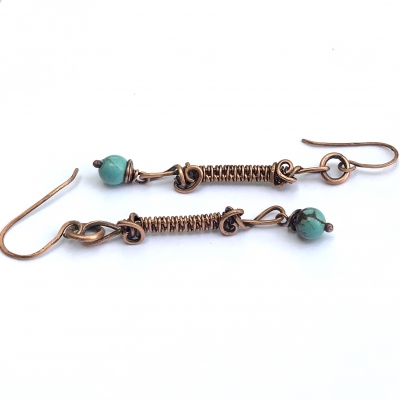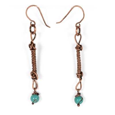 These stunning blue howlite earrings are suspended by a link, created with my favorite kind of weaving pattern. Vintage pure, copper wires. Earrings measure 2 1/2'' long. French wires. Liver of Sulfur is used to create an antique finish. The earrings are protected with a thin layer of ProtectaClear.