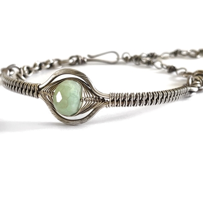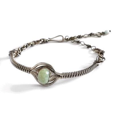 This bracelet is made from Sterling Silver wires using a woven technique as a middle element. Hand faceted amazonite adds glory to this sterling piece. Finished with Sterling Silver chains. Measures 9 inches long.