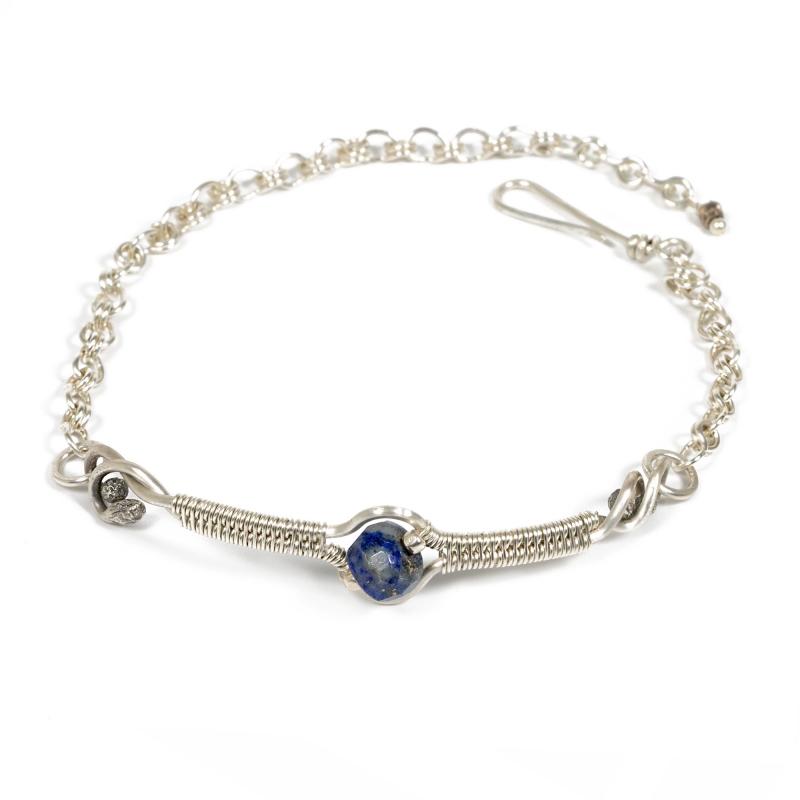 This bracelet is made from Sterling Silver wires using a woven technique as a middle element. Hand facetted Lapis adds glory to this sterling piece. Finished with Sterling Silver chains. Measures 10 inches long.