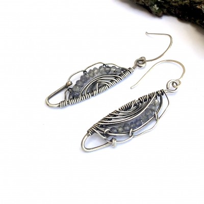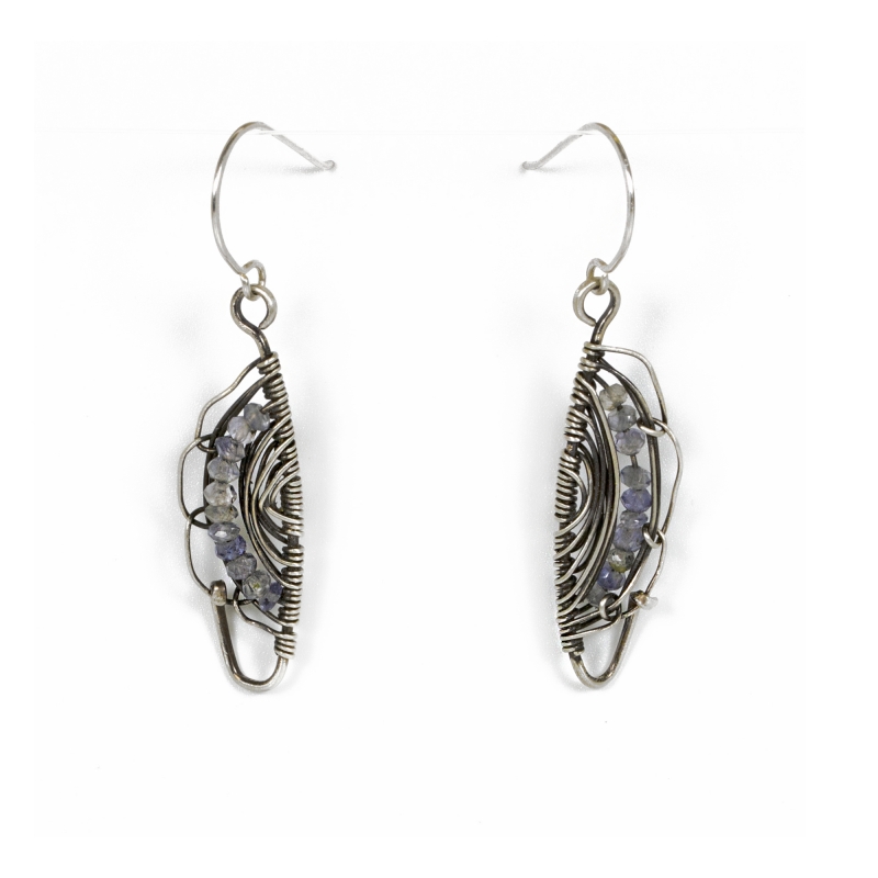 Handcrafted out of Sterling Silver wire. These wing earrings are made using small Iolite faceted beads. Measures 2 inches long. French wire. Liver of Sulfur is used to create an antique finish.