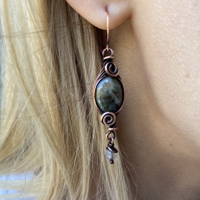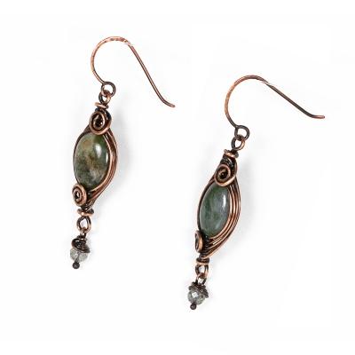 Hand-crafted out of vintage, pure copper wires with smooth, domed jasper stones. Copper rosebuds hug the top and bottom of the set stones, creating an elegant, every-day pair of earrings. Measures 2'' long. French wires. The Liver of Sulfur is used to create an antique finish. The earrings are protected with a thin layer of ProtectaClear to prevent tarnishing.