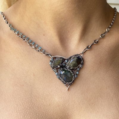 Hand-crafted silver chain with inclusions of both aquamarine and silver statement links. All components are hand done, including the centerpiece of netted labradorite and zircon. Necklace measures 22", but can be adjusted to any shorter length. Pendant measures 1 3/4". Liver of Sulfur is used to create an antique finish.