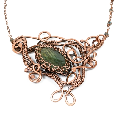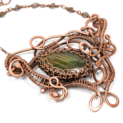 One of a kind, a freeform, shaped necklace made out of pure copper wires and gorgeous labradorite. The centerpiece is about 3 inches wide and 2 12 inches in height. The necklace measures 23 inches long but can be adjusted to any shorter length.