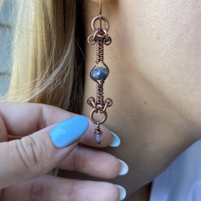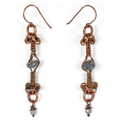Hand-crafted out of vintage, pure copper wires. A thin labradorite bead is captured in my favorite type of weaving. Measures 2 3/4'' long. French wires. Liver of Sulfur is used to create an antique finish. The earrings are protected with a thin layer of ProtectaClear to prevent tarnishing.