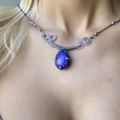 Hand-crafted with hand-made silver links, and a beautifully woven centerpiece. The middle component holds a one-inch Lapis Lazuli stone. Tiny inclusions of labradorite can be spotted on the side chains. Overall necklace measures 21" long but can be adjusted to any shorter length. Liver of Sulfur is used to create an antique finish.