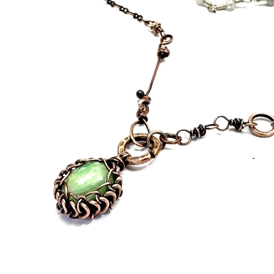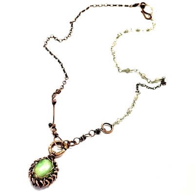 This simple necklace was created with thin copper chains and a simple wire-wrapped jasper cabochon, and sterling silver. A few copper jump rings add variety to the piece, while still keeping it a simple, everyday-wear piece. The necklace measures 21 1/2'' long, but can also be shortened to any other length. Liver of Sulfur is used to create an antique finish. It is protected with a thin layer of ProtectaClear to prevent tarnishing.