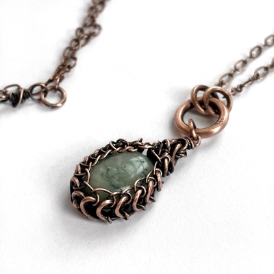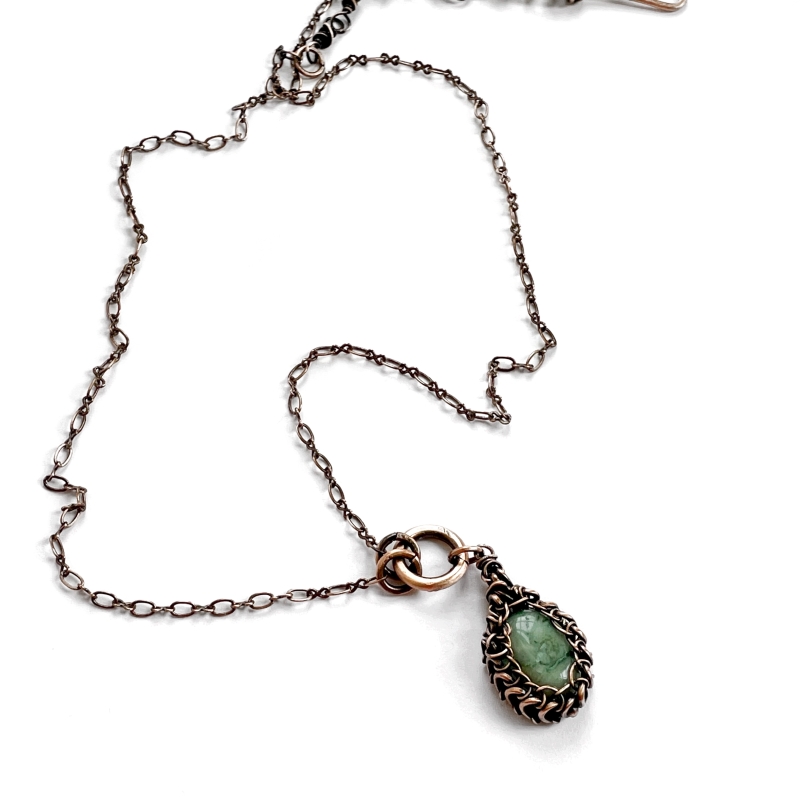 This simple necklace was created with thin copper chains and a simple wire-wrapped jasper cabochon. A few copper sjumprings add variety to the piece, while still keeping it a simple, everyday-wear piece. The necklace measures 22'' long, but can also be shortened to any other length. Liver of Sulfur is used to create an antique finish. It is protected with a thin layer of ProtectaClear to prevent tarnishing.