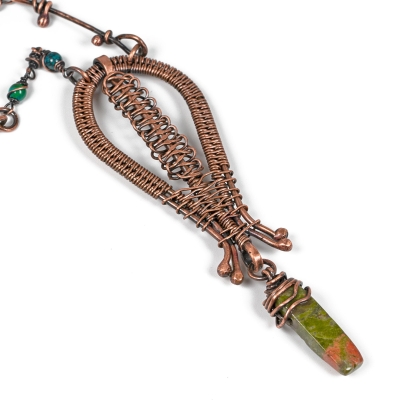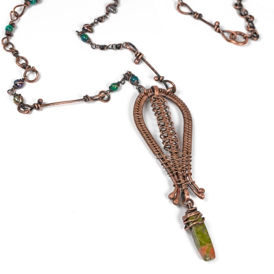 This necklace is completely handmade using a macrame and wire-wrapping technique. The chain is done by hand with unique copper links and gemstones. The pendant is 4'' long and done with a combination of techniques- macrame, weaving, and knitting. A truly unique piece. Antiqued with liver of Sulfer and protected with ProtectaClear.