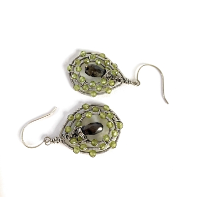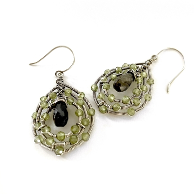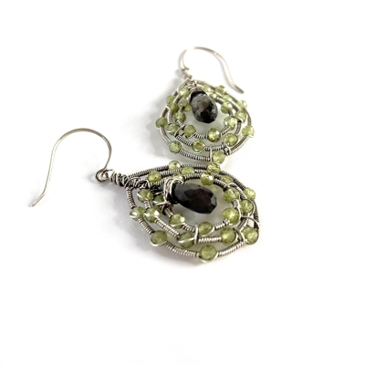 Hand-crafted with silver wires, twenty-two faceted peridot gems are held together in a simple wirework design. Earrings measure 2" long. French wires. Liver of Sulfur is used to create an antique finish.